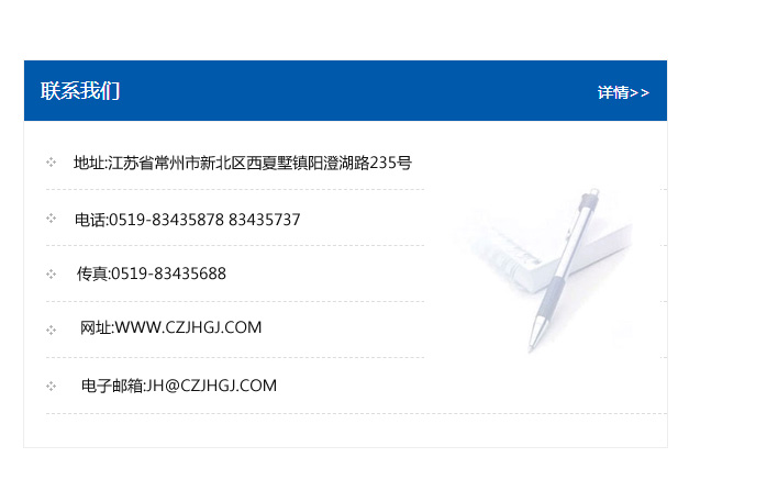 地址:常州市新北區友邦商務大廈1幢16、17層  電話:0519-85101652  傳真:0519-85112595  郵編:213022  網址:www_cz-jiayue_cn.dxys168.com  郵箱:xiajifengaa@163.com